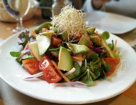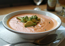 1. house salad 2. vegetable cream 3. salmorejo with Avocado 4. gazpacho 5. dish of the day.
